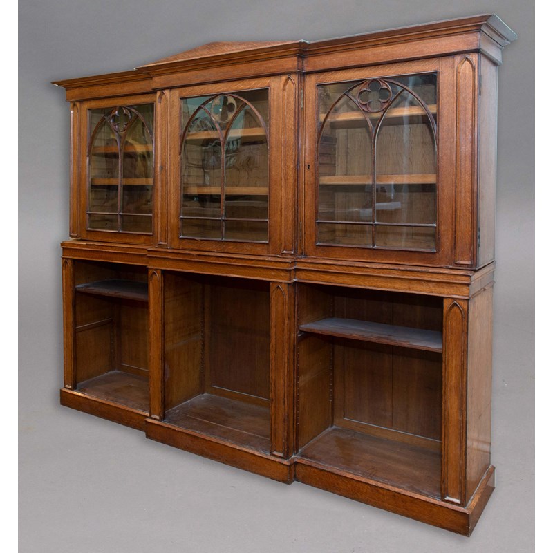 VICTORIAN GOTHIC BREAKFRONT CABINET, with three glazed doors with gothic roundels on a base with open shelving, height 163cm, width 195cm, depth 37cm