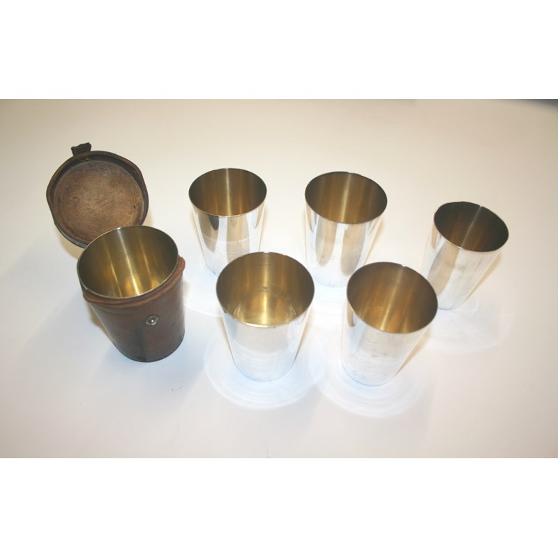 a leather case fitted with a silver plated cup, and 5 additional cups. The leather and the cups marked for Asprey, London. Case 10cms high