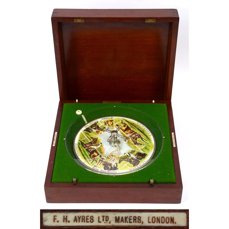 in a square mahogany case and with original key, with a roulette style spinning wheel, horse racing cards, gaming counters etc. Made by F H Ayres, London.