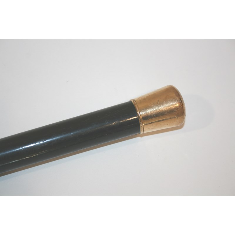 GOLD TOP WALKING STICK with a 15ct gold top and ebonised wooden shaft, and with a brass ferule at the base. 92cms long