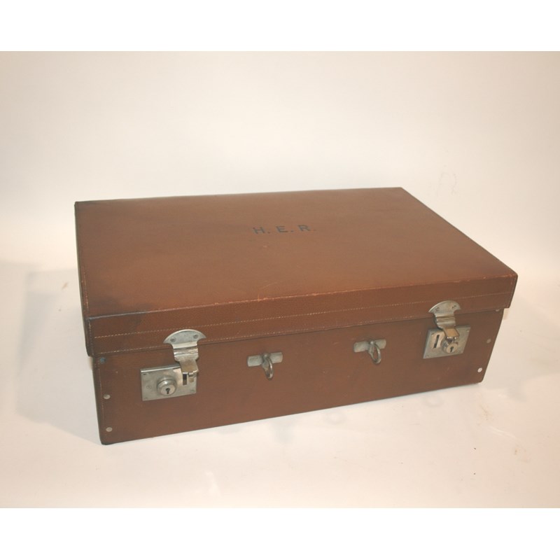 ASPREYS LEATHER SUITCASE a brown leather suitcase by Aspreys, with compartments inside for dressing table bottles (bottles no longer present) and a smaller attache case. With an outer protective case, Case 66cms by 41cms