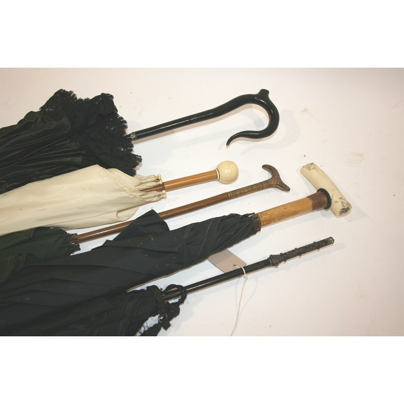 IVORY TOP PARASOL mounted with an ivory billiard ball handle, and with a wooden and metal shaft. Also with 4 other umbrellas and parasols. (5)