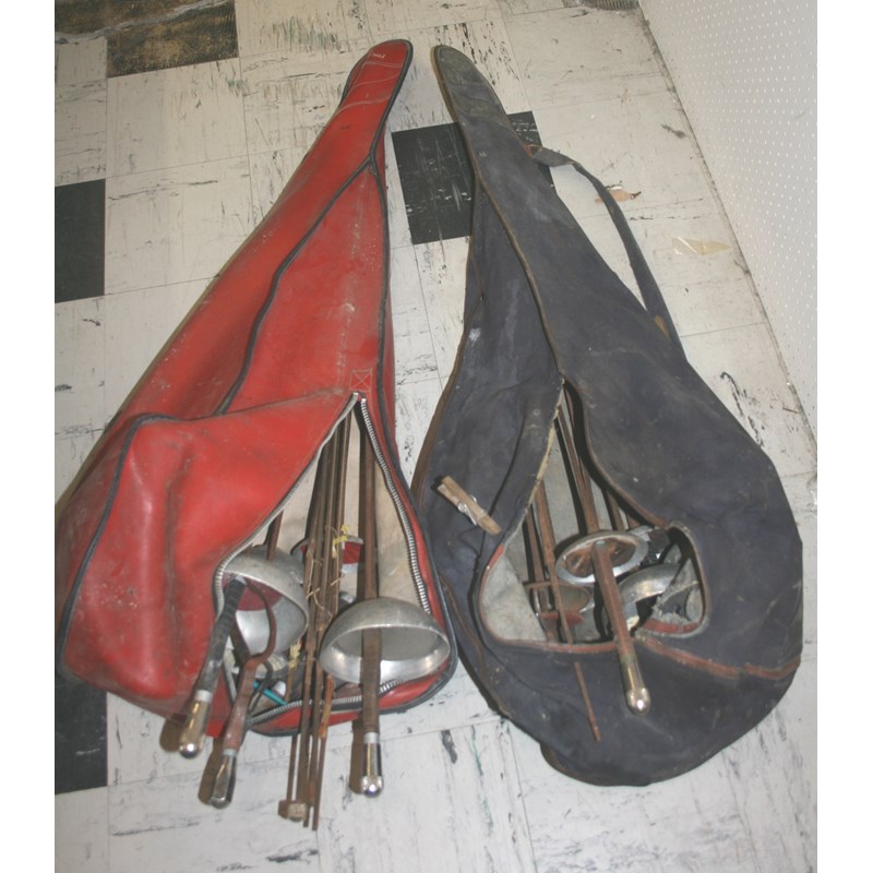 ASSORTED FENCING EQUIPMENT including various foils, head protectors and clothing. The foils contained in two large bags.