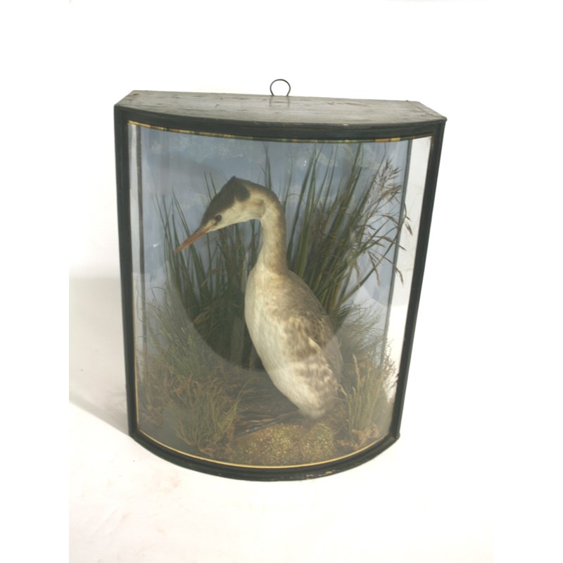 CASED GREBE a mounted Grebe set in a naturalistic background and painted background. In a bow front glazed and wooden case. Case 47cms high
