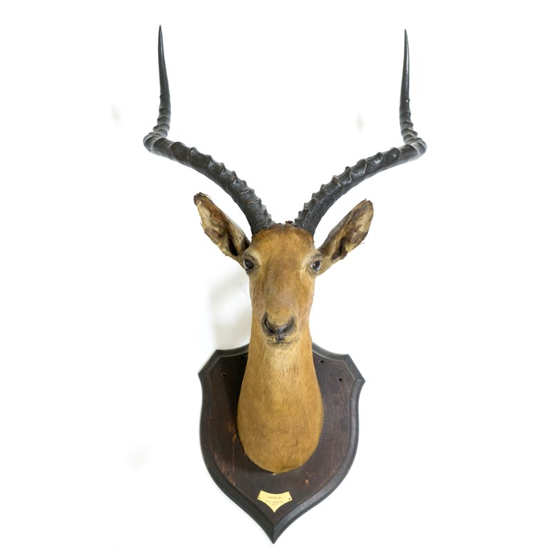 ROWLAND WARD - IMPALA an Impala mounted on an oak shield, with a plaque which reads Impala, B.E Africa 1907. The reverse carved with the initials RW for Rowland Ward.
