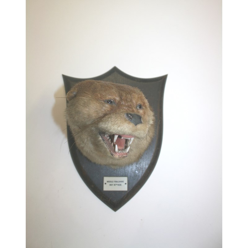 MOUNTED OTTER - SPICER & SONS an Otter head mounted on an oak shield, with a plaque 'Middle Foulshore, May 16th 1938. Marked on the back, Spicer & Sons, Taxidermist, Leamington.