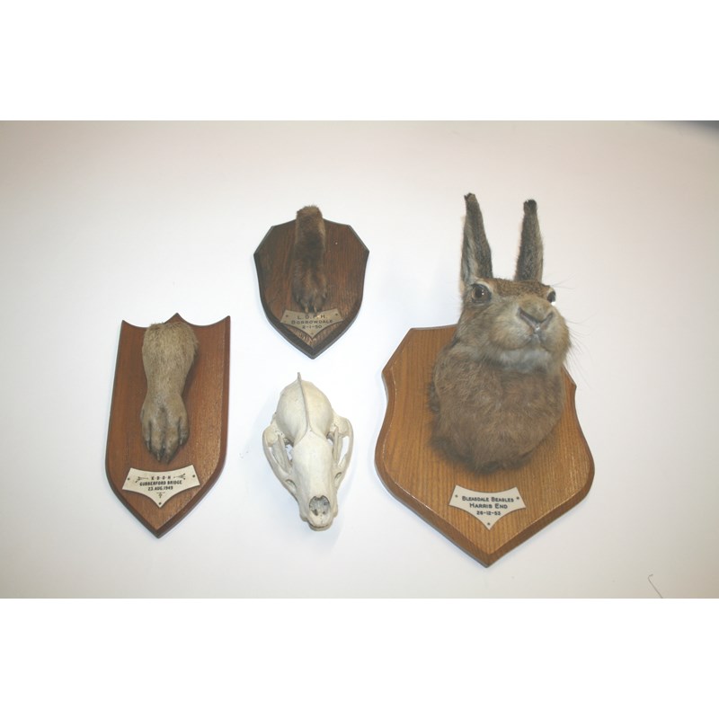 a Hare mounted on an oak shield by T Salkeld, with a plaque for Bleasdale Beagles, Harris End, 26-12-53. Also with with two animal feet mounted on wooden plaques (also mounted by T Salkeld), and a animal skull. (4)