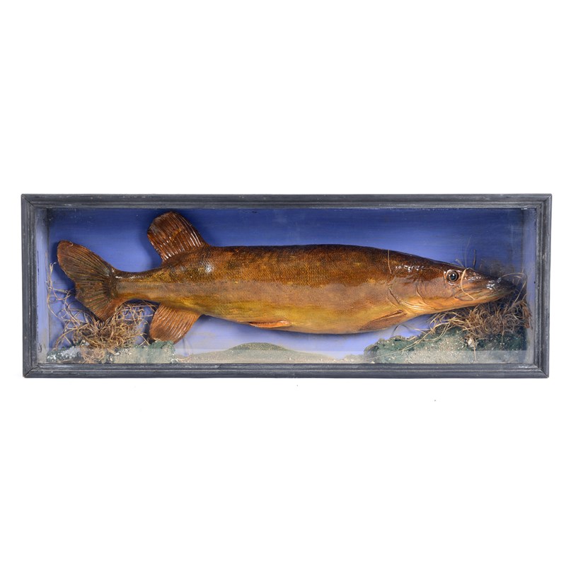 CASED FISH - JACK PIKE a Jack Pike mounted in a wooden and glazed case. Case 55cms across