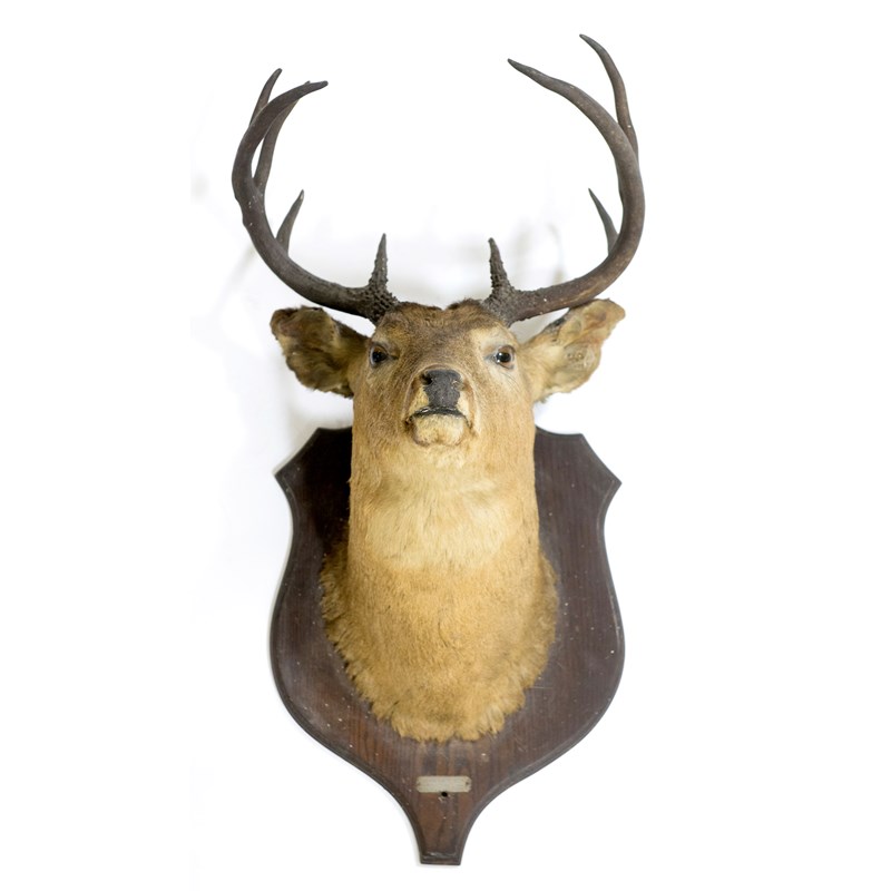 MOUNTED STAGS HEAD - JOHN HARRISON a Stag's head mounted on an oak shield. With a plaque, John Harrison, Taxidermist. Shield 55cms high
