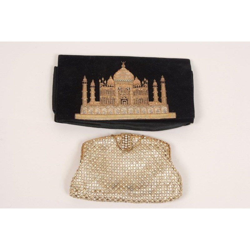 Heavy with diamantes laced together over a cream satin liner. Clasped with gold metal, small gold chain handle. Inside 'Handmade in France' two pockets and a separate purse. 6" x 4". In it's original box. A further black velvet Indian evening clutch bag with The Taj Mahal embroidered in raised gold thread embroidery. 8" x 4". (2)