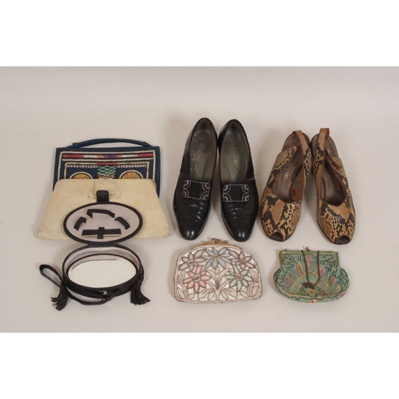 Black leather shoes with beaded buckle, louis heel, Labelled 'The Brit-Ban Shoe' Size 4.5D. A pair of 1930's python skin shoes, broken strap Size 5. Four clutch bags and mirror and comb set. (7)