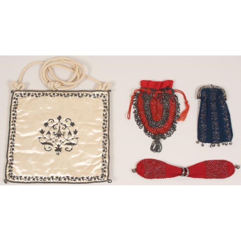 A misers purse dating to the late 1700's, with metal beadwork and bells at each end. A knitted purse with metal bead work circa 1700's and a further later beaded purse with drawstring. And a satin shoulder bag with metal purl work. (4)