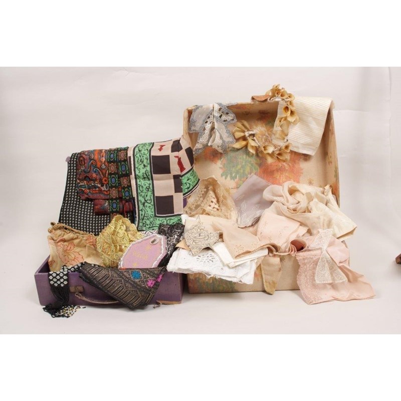 In two fabric covered boxes, a mixed lot of vintage scarves, beaded trims, handkerchiefs. collars and other accessories. (qnty)