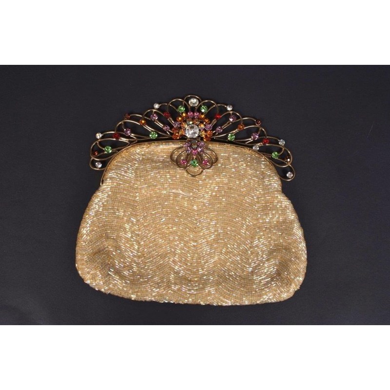 From the 1970's this evening bag has been covered in sparkling mother of pearl bugle beads. The clasp is embellished with paste jewels, lined in cream satin. Labelled 'Butler and Wilson'. 9" x 8.5" (1)
