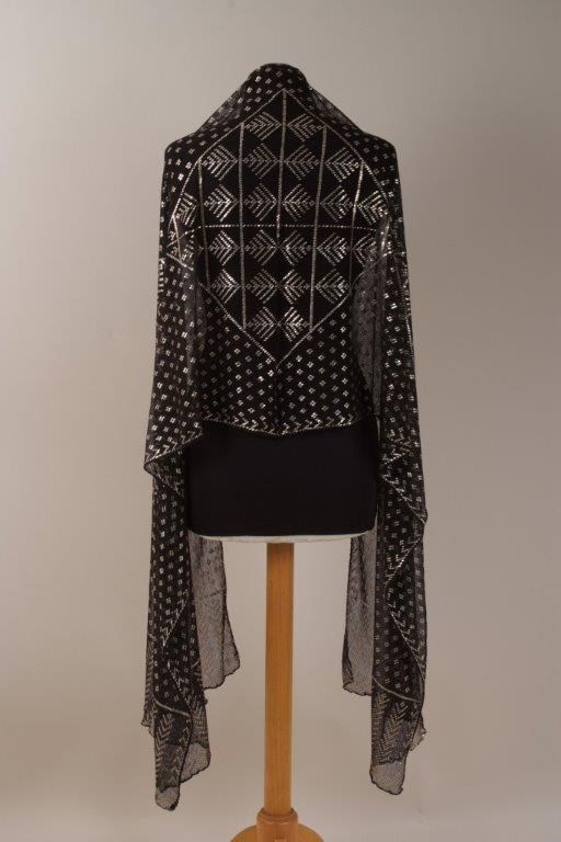 A BLACK AND SILVER ASSUIT SHAWL A black net shawl with silver metal embellishments. 85" long x 21" wide. (1)