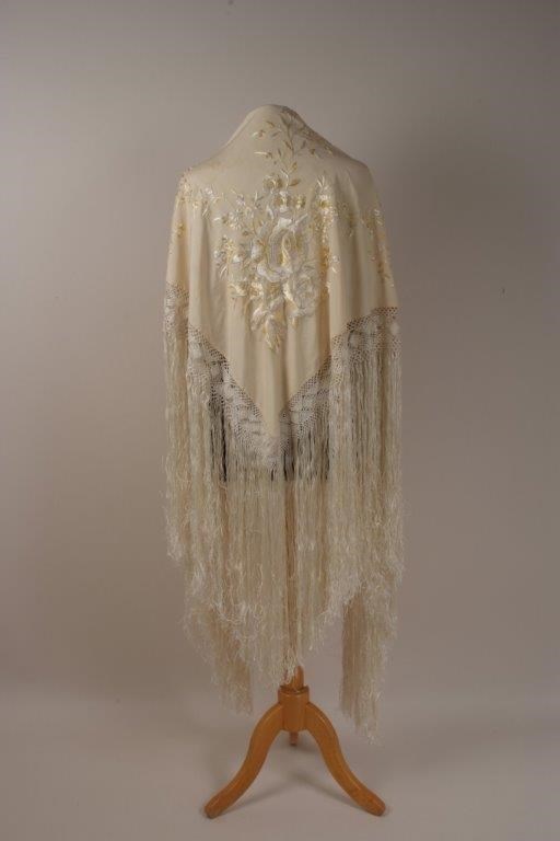A CREAM SILK PIANO SHAWL Embroidered in white and gold satin stitch on a cream silk ground. Fringed edge. 45" x 45" x 21" fringe. marked (1)
