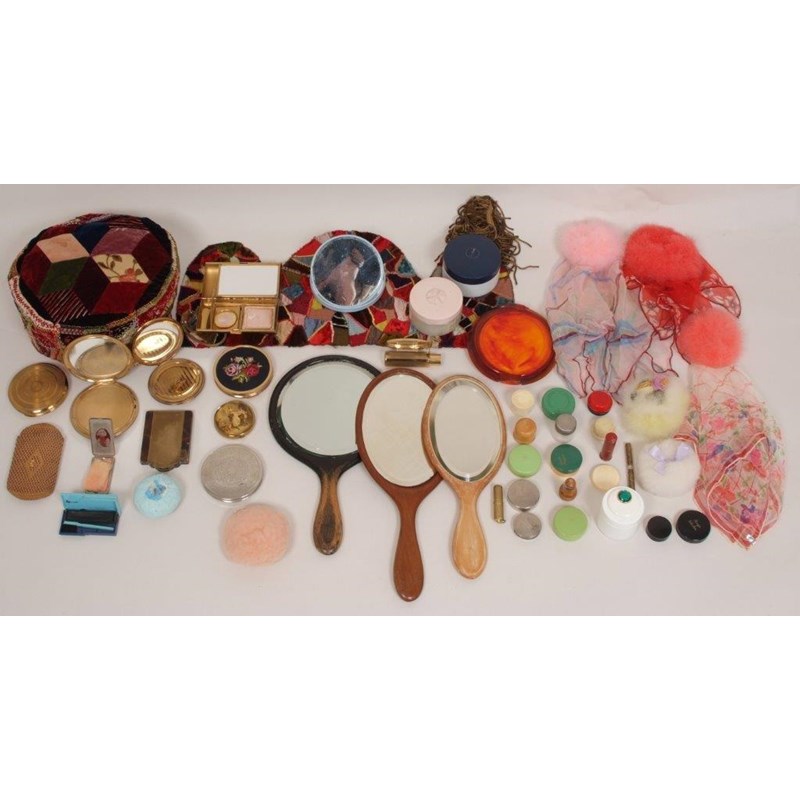 A MIXED LOT OF COMPACTS AND DRESSING TABLE ITEMS To include compacts, mirrors make-up containers, powder puffs, and various other items. (qnty)