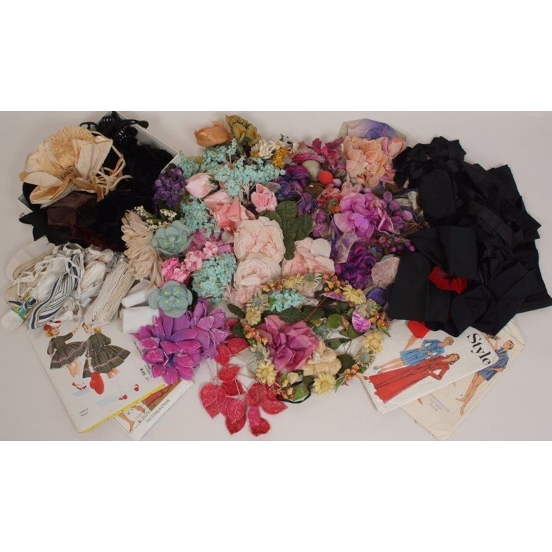 A BOX VINTAGE SILK FLOWERS AND MIXED HABERDASHERY A collection of vintage corsages and boxes of vintage ribbons etc. (quantity)