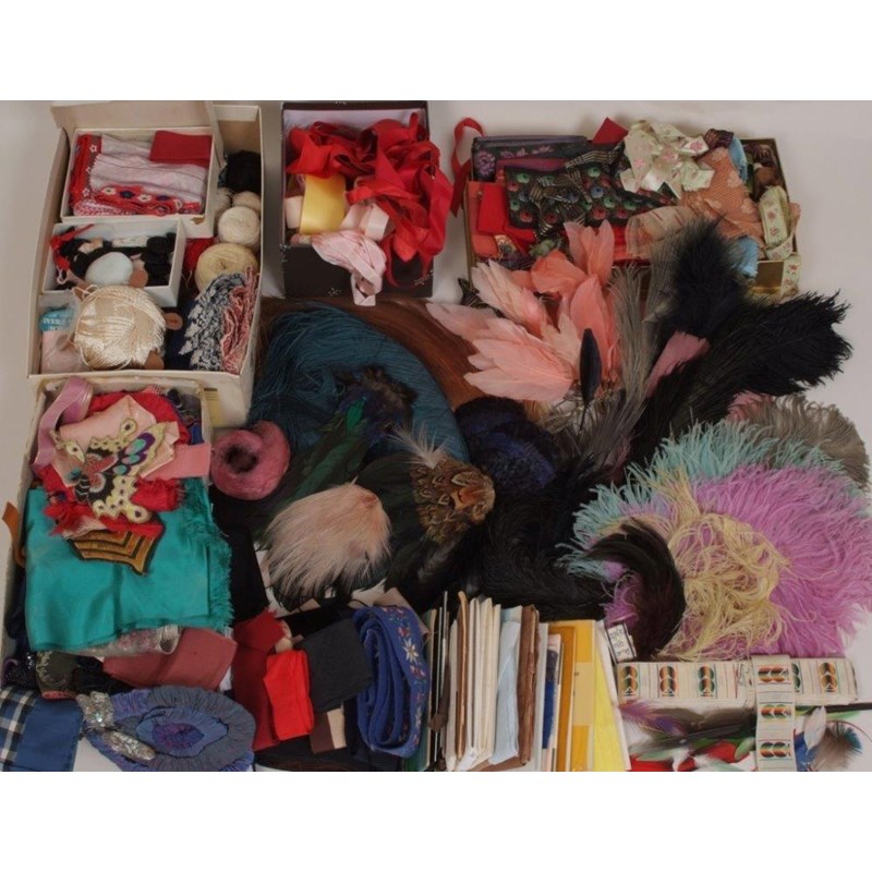 A COLLECTION OF HABERDASHERY AND MILLINERY ITEMS A quantity of feathers, ribbons and a roll of CC41 Utility labels. (qnty)