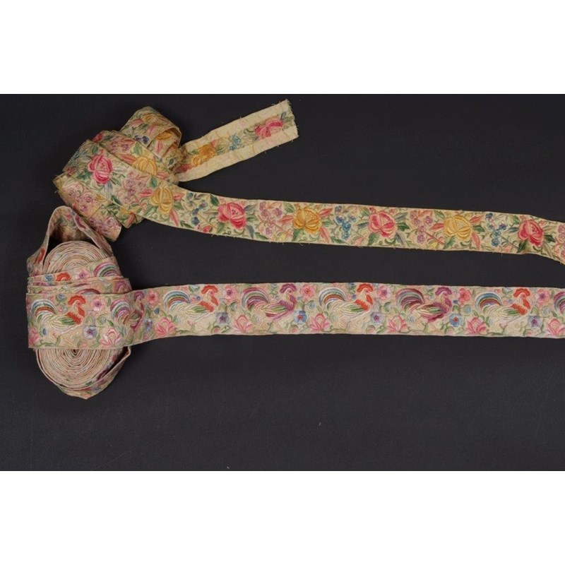 A long length of 1950's machine embroidered trim on cream silk, repeat pattern of colourful cockeral and flowers, unused. 2" wide x metres long. Together with a long length of 1950's machine embroidered trim, with floral repeat pattern on cream silk. Unused. 1.5" x metres long. And a delicate silk damask Chinese cuff embroidered with Peking knot and satin stitch. (3)