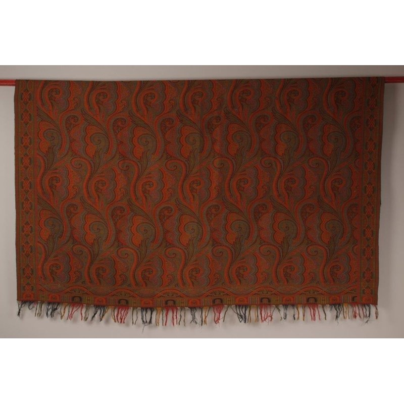 An Edwardian Woven shawl in paisley design in reds, green and black. 67" x 68" Good condition. a further Victorian shawl in Paisley design. 61" x 128". (2)