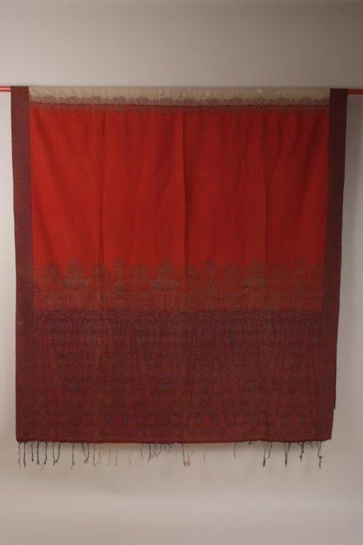 A Turkey red and cream /white centred shawl, patched and darned. 57" width x 116" long. And a further paisley woven shawl. 64" width x 134" long. (2)