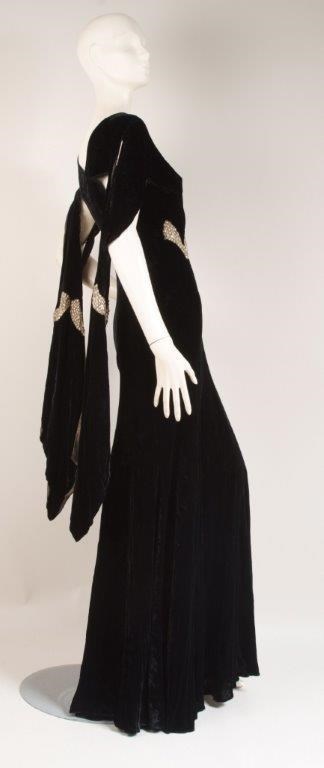 Black silk velvet bias cut evening gown, embellished with gold scarab backs. Long gold lame lined sleeves emphasising the silhouette of the body. No label. Waist 24". (1) (damaged)