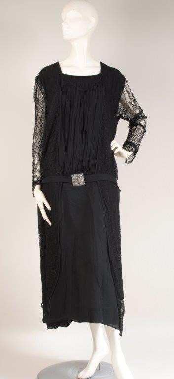 Black crepe silk dress with outer layer of lace, fine pleated front leading down to a drop waist with diamante buckled belt. Lined in soft black silk, pretty lace sleeves. 40" hips x 40" Bust x 49" Length. (1)