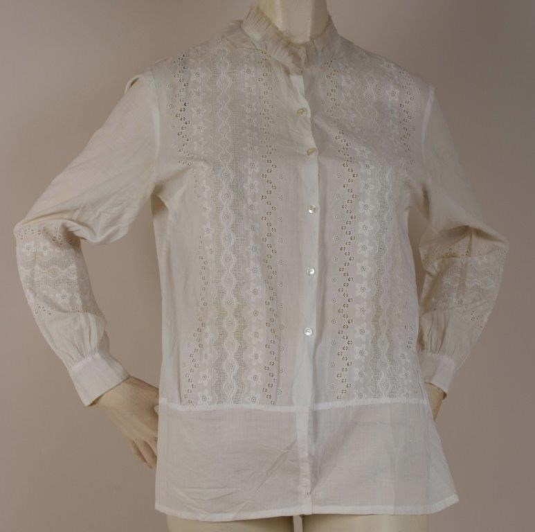 A fine cotton shirt with cut and drawn embroidery insets. Buttons not original and possible later cotton extension on the bottom. (1)