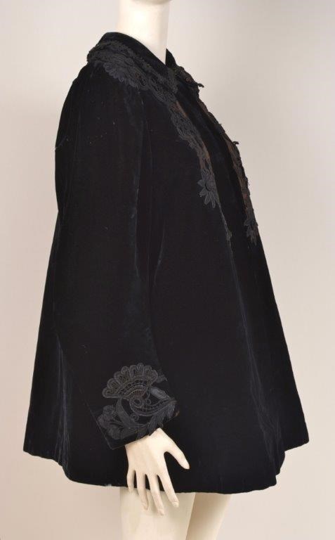 A black heavy velvet coat with frogging on collar and cuffs. Lined and fastened with hook and eyes down the front. Bust 40" x 29.5" Length. (1)