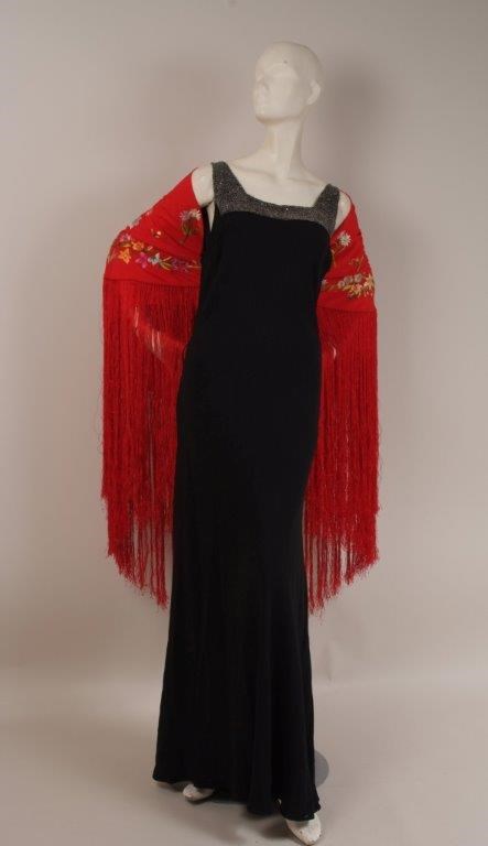 A Black bias cut crepe dress, with a beautiful beaded border. Waist 28" x 34" Bust x 58". And a round red embroidered piano shawl. 43" across x fringe length 20". (2)