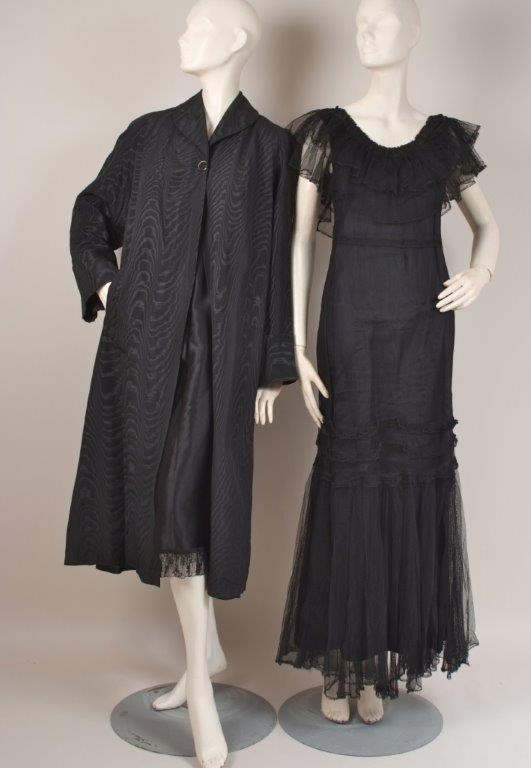 A 1930's black net evening dress Bust 34" x 28" Waist x 54" Length (small repair in front at waist, 5 pence size hole on bottom and two more small holes on bottom net tier). Long silk taffeta coat with single button 48" Length and satin/silk lace trimmed slip. (3)