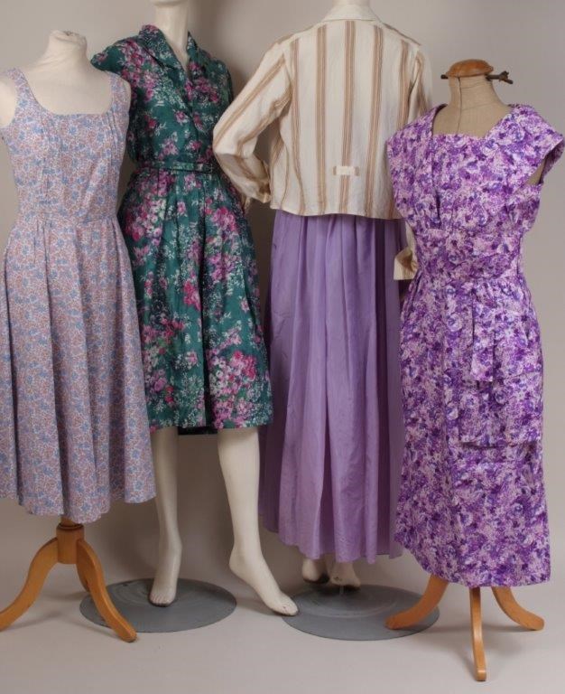 A collection of vintage dresses to include a sleeveless cotton floral dress Bust 38" x 30" Waist x 40" Length, a Benham green floral silk dress with belt and side zip Bust 38" x 32" Waist Size 40, a stripy silk shirt with button, a lilac silk dress with boned bodice Bust 30" x 28" Waist x 55" Length and a purple silk dress Bust 38" x 30" Waist x 44" Length. (5)