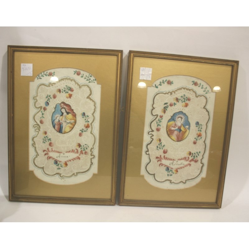 a pair of hand coloured Valentines, with a religious figure in the centre and each inscribed with a name. Both mounted and framed and with information on the reverse. (2)