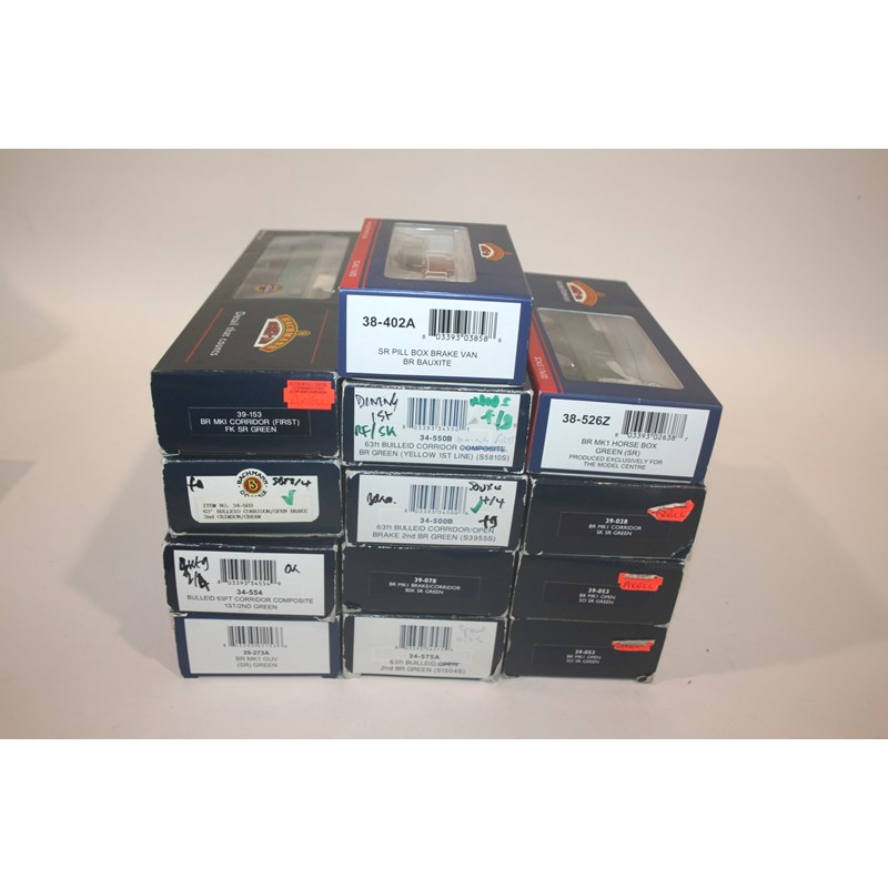 13 boxed items including, 38-402A Brake Van, 38-526Z Horse Box, 39-053 Open Corridor Coach (2), and 9 other items (some with writing on the boxes). (13)
