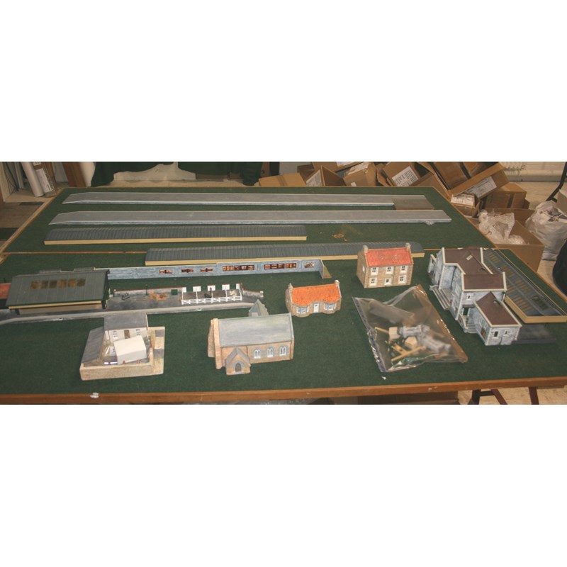 including a model Station Terminus, platform and canopies (for re assembly), and some good quality plaster models of buildings for use on a Railway layout.