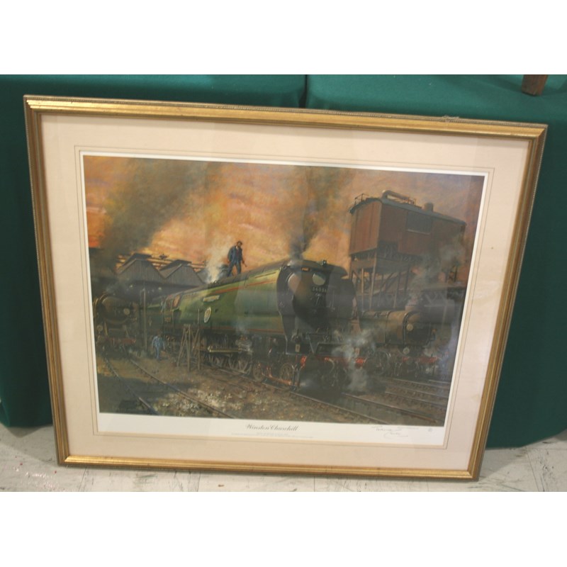 4 framed signed prints by Terence Cuneo, including Winston Churchill (136 of 850), Portline (238 of 850, LNER Mallard (183 of 850), and Castle on the Coast (85 of 500). Also with two other prints. (6)
