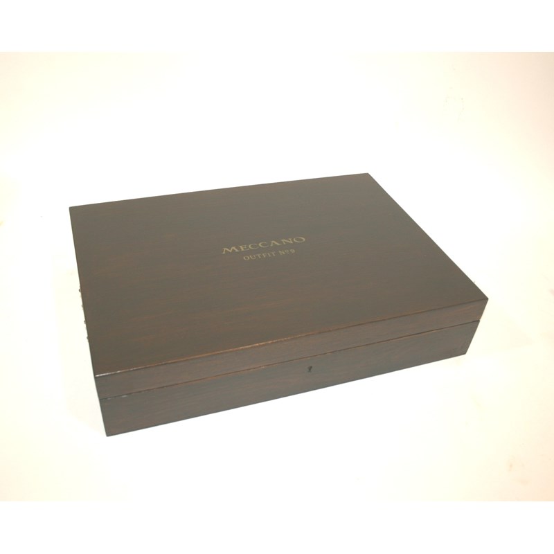 a boxed set of Meccano Outfit No 9, with 2 layers of items and in an oak case. Also with an instruction book for this set. Box 51cms across