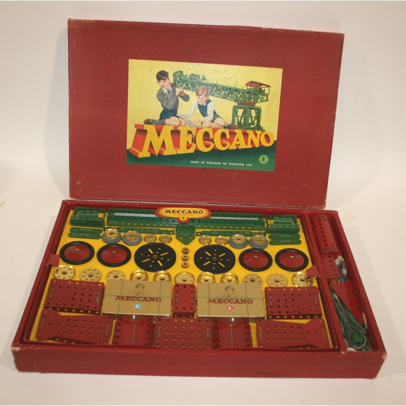 a boxed construction set No 8, with two layers of accessories including 2 Meccano tins (8.1 and 8.2). Also with an instruction booklet for Outfit No 7/8.
