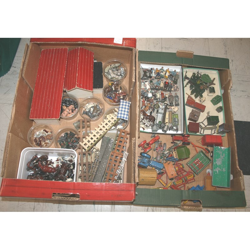 including a Britains Huntswoman & 4 Hounds, a large collection of farming figures and farm animals. Also with some machinery, fencing, buildings, kennels, trees etc.
