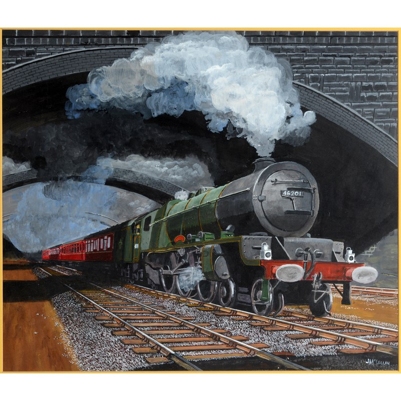 an original gouache painting of a Princess Elizabeth 46201 Railway Locomotive passing under a bridge. Signed bottom right, J McLellan, and mounted and framed. 54cms by 47cms, Frame 79cms by 73cms