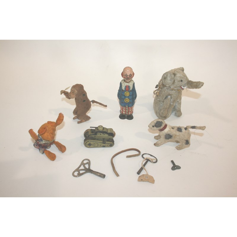 CLOCKWORK TOYS including a clockwork Dog with wagging tail (working), a German tin plate clown, a clockwork Elephant, a clockwork Monkey, clockwork Tank etc. Dog 10cms long