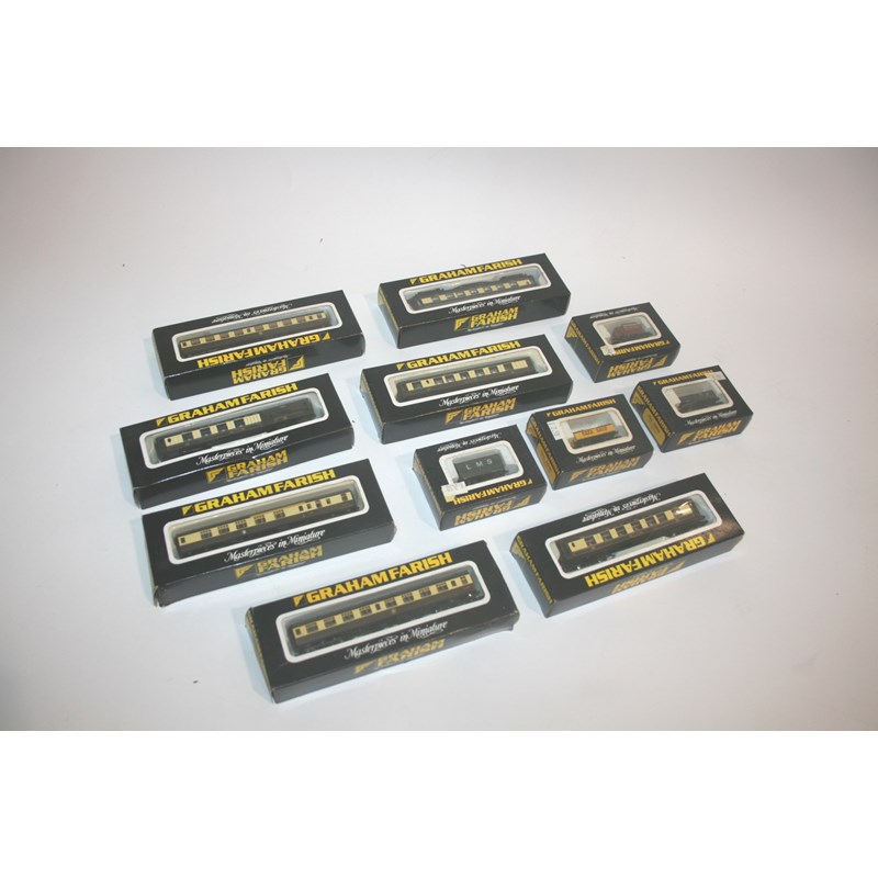 GRAHAM FARISH 'N' GAUGE including 7 various boxed coaches including No 0684 Brown/Cream, boxed wagons, loose boxes and accessories. Also with a part Lima train set.
