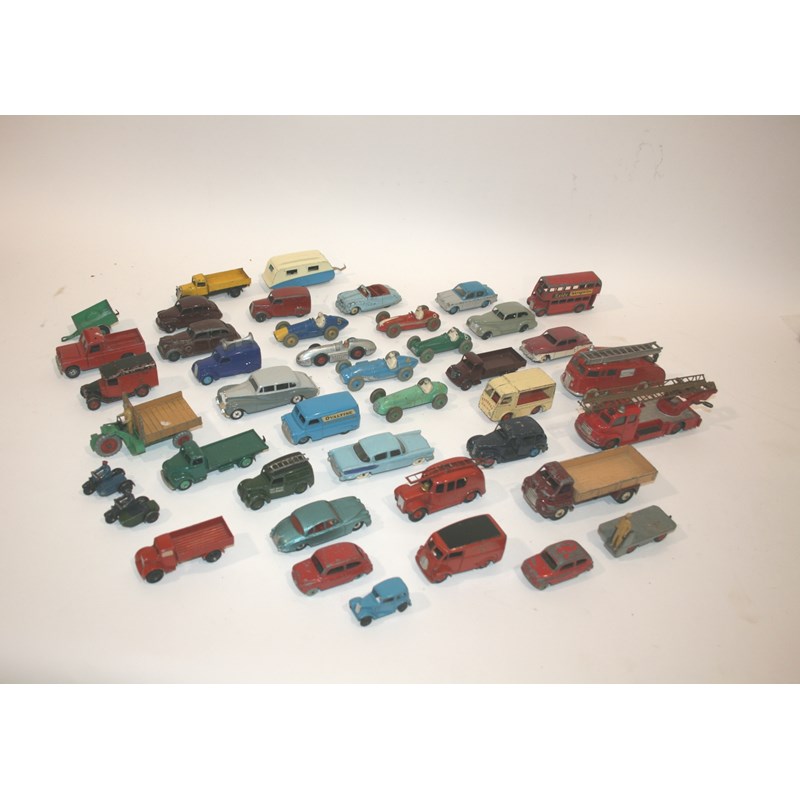 including examples by Dinky (175 Hillman Minx, 23C Cooper Bristol, 23N Maserati, 23K Talbot Lago, 23J HWM, Bedford Ovaltine, 23E Speed of the Wind, 23H Ferrari, 260 Royal Mail Van, 261 Telephone Service Van, 955 Fire Engine, and many more).