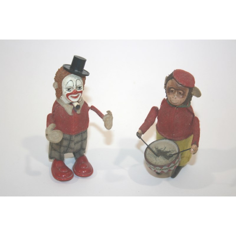 TWO SCHUCO CLOCKWORK TOYS including a Monkey with a drum, and a Smoking Clown. Both with clockwork mechanisms, no key. (2)