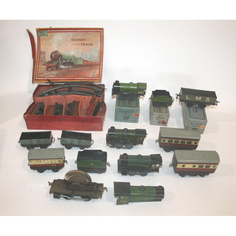 including M1/2 Tender (boxed), M1 LMS Wagon, and Clockwork Locomotive (boxed). Also with 2 unboxed locomotives, coaches and wagons, tenders, part locomotives, and boxed and unboxed track.