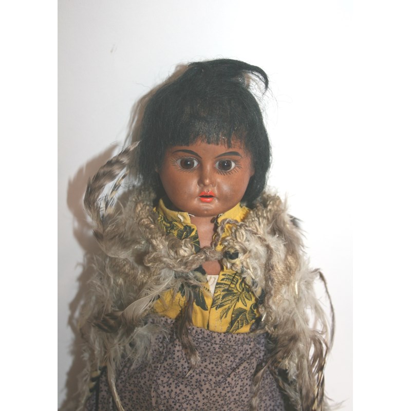 an unusual doll with a brown bisque head, with fixed brown eyes, open mouth and dressed in Maori clothing. Marked, Horseshoe mark for Ernst Heubach, 1902-10/0. 11ins (28cms) high