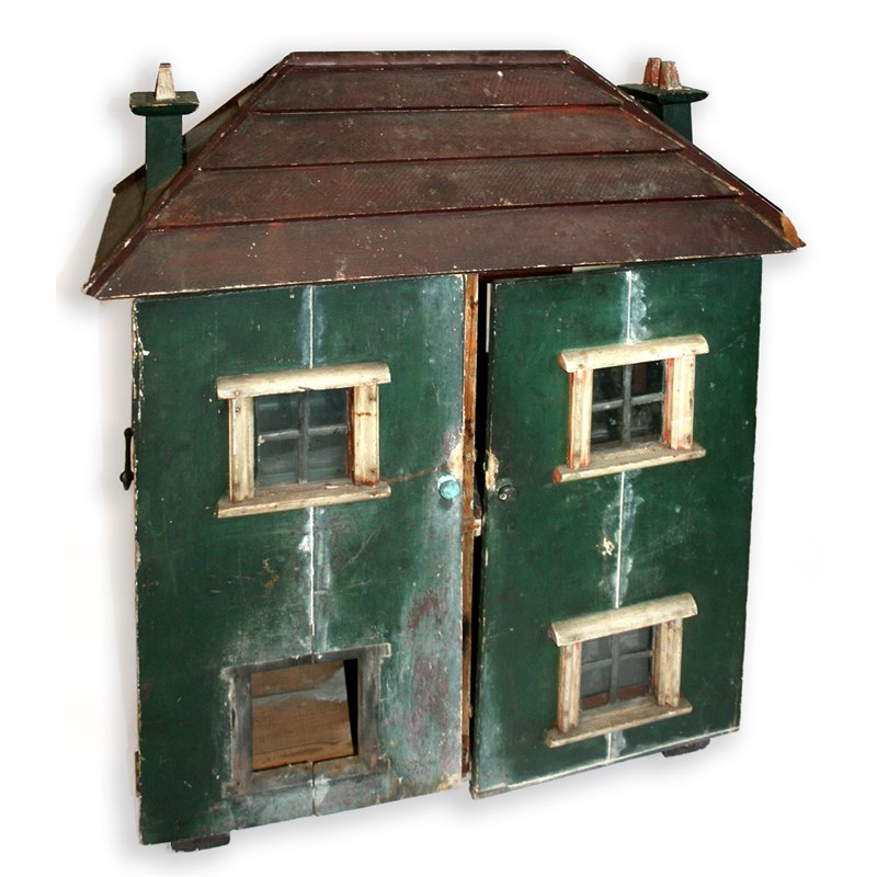 an antique 2 storey wooden dolls house with internal fireplaces, opened from the front and with carrying handles on both sides, some restoration required. Also with some dolls house furniture and accessories. 89cms high