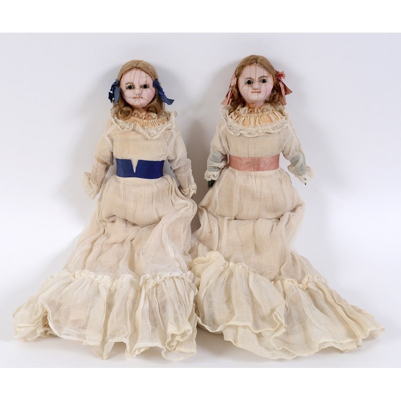 a pair of early 19thc dolls with wax heads and leather arms, the two 'sisters' with matching original clothing and different colour sashes. 17ins (44cms) high. (2)