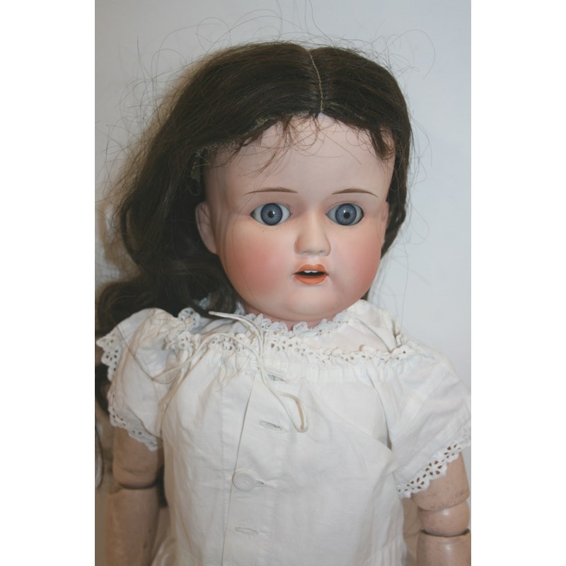 an interesting large bisque head doll with weighted blue eyes, open mouth and jointed composition doll. Impressed marks, FY, 1006, possibly made by Morimura Brothers (FY mark is found on some of their items). 27ins (69cms) high